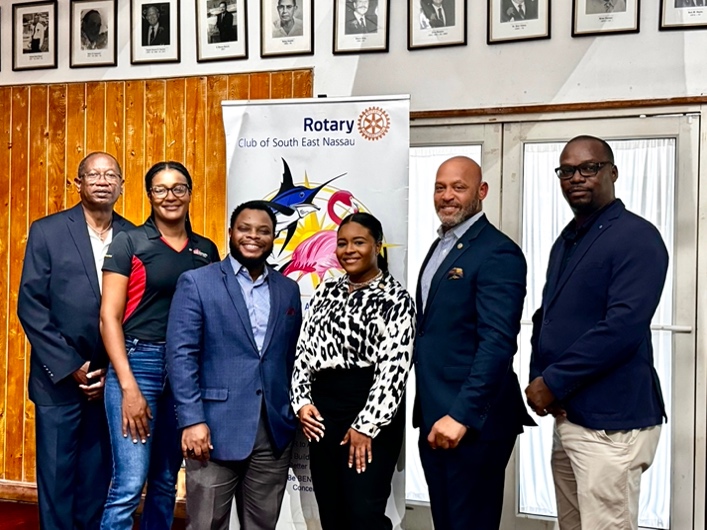 The newest members of the Rotary Club of South East Nassau, shown from left to right, are Rev. Canon Stephen Davies, Narissa Penn, Wilfred Bain, and Willicia Hart, who gave job talks at the club on August 20, 2025. AG Lionel Haven and PP Jamaal Davis join them in the photo. Missing are PP Montgomery Penn and Rotarian Don Williams.