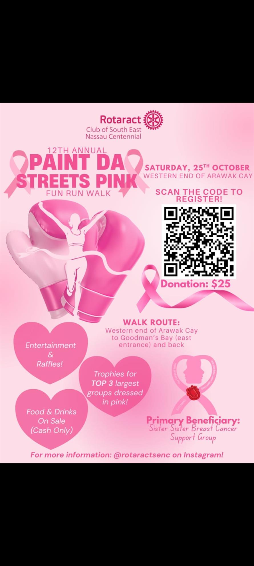 Join the Rotaract Club of South East Nassau Centennial for our 12th Annual Paint Da Streets Pink Fun Run Walk — happening Saturday, October 25th, 2025, at the Western End of Arawak Cay! 🌸